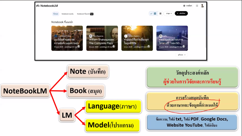 ซึ่งโครงการฝึกอบรมฯ เป็นหนึ่งในโครงการภายใต้ดำริของ ผอ. สทส. เรื่องการสร้างอัตลักษณ์ศูนย์การเรียนรู้ของศูนย์ถ่ายทอดเทคโนโลยีการสหกรณ์ ได้รับเกียรติจาก นายชายชาญ อาษาพล ผู้อำนวยการศูนย์ถ่ายทอดเทคโนโลยีการสหกรณ์ที่ 6 จังหวัดนครราชสีมา เป็นวิทยากรตลอดการฝึกอบรม โดยมีผู้เข้าอบรมรวมทั้งสิ้น 486 ราย แบ่งเป็น บุคลากรกรมส่งเสริมสหกรณ์ 372 ราย เจ้าหน้าที่สหกรณ์ 69 ราย และบุคคลทั่วไป 45 ราย ซึ่งมีเป้าหมายการฝึกอบรมคือ ผู้เข้าอบรมทุกคนมีความเข้าใจหลักการทำงานของโปรแกรม NotebookLM และสามารถนำไปประยุกต์ใช้กับการปฏิบัติงานได้