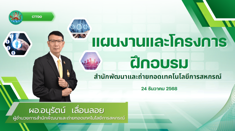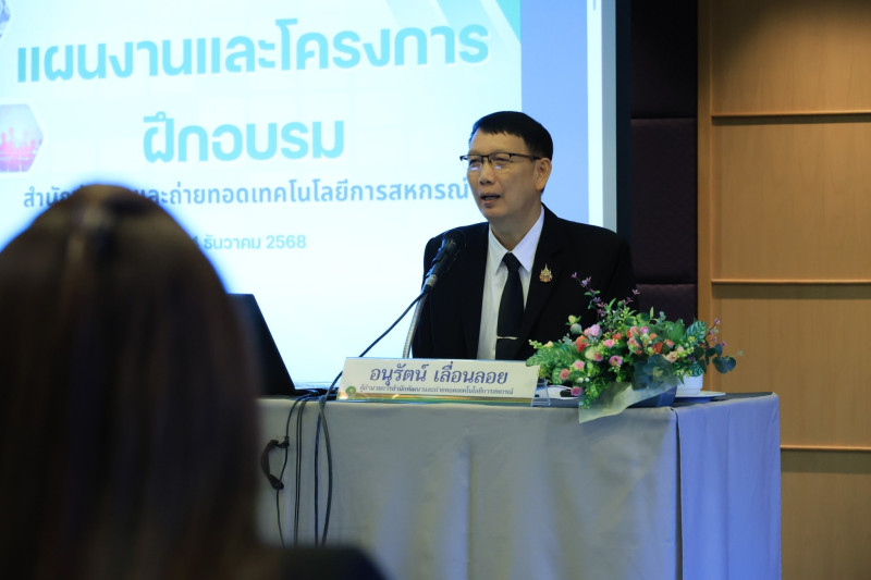 วันที่ 24 ธันวาคม 2568 นายอนุรัตน์ เลื่อนลอย ผู้อำนวยการสำนักพัฒนาและถ่ายทอดเทคโนโลยีการสหกรณ์ เป็นวิทยากรบรรยาย หัวข้อ “แผนงานและโครงการฝึกอบรม” ของสำนักพัฒนาและถ่ายทอดเทคโนโลยีการสหกรณ์ แก่ผู้เข้ารับการฝึกอบรม หลักสูตร “การพัฒนาศักยภาพผู้บริหารระดับอำนวยการ (สหกรณ์จังหวัด)” ณ โรงแรมรอยัล ริเวอร์ เขตบางพลัด กรุงเทพมหานคร