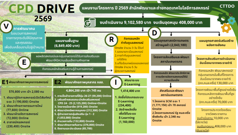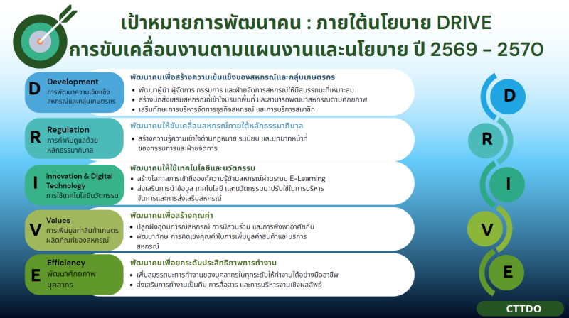 แผนงานและโครงการฝึกอบรมของ สทส. ดังกล่าว มีเป้าหมายหลัก คือ พัฒนาบุคลากรกรมส่งเสริมสหกรณ์ และบุคลากรสหกรณ์ให้มีศักยภาพ สามารถสร้างสหกรณ์ให้เป็นองค์กรที่มีสมรรถนะสูง เป็นที่พึ่งพิงของมวลสมาชิก ภายใต้นโยบาย “CPD DRIVE การขับเคลื่อนงานตามแผนงานและนโยบาย ประจำปี 2569 – 2570” ที่มุ่งเป้าหมายหลักสำคัญ 5 ด้าน ประกอบไปด้วย 1. ด้านการสร้างความเข้มแข็งให้สหกรณ์ และกลุ่มเกษตรกร 2. ด้านการขับเคลื่อนสหกรณ์ภายใต้หลักธรรมาภิบาล 3. ด้านเทคโนโลยีนวัตกรรม 4. ด้านการสร้างมูลค่า และ 5. ด้านการยกระดับประสิทธิภาพการทำงาน
