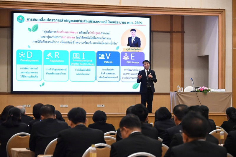 โอกาสนี้ อธิบดีกรมส่งเสริมสหกรณ์ ได้บรรยายพิเศษ ในหัวข้อ “การขับเคลื่อนภารกิจของกรมส่งเสริมสหกรณ์“ ซึ่งได้กล่าวถึงผลการขับเคลื่อนโครงการสำคัญของกรมฯ ในปีงบประมาณ พ.ศ. 2569 และแผนการทำงานในไตรมาสต่อไป ที่จะต้องมุ่งเน้นการส่งเสริมและพัฒนา พร้อมทั้งกำกับดูแลสหกรณ์และกลุ่มเกษตรกรทั่วประเทศอย่างสมดุล โดยใช้เทคโนโลยีและนวัตกรรม ภายใต้หลักธรรมาภิบาล เพื่อเสริมสร้างความเข้มแข็งและเติบโตอย่างยั่งยืน รวมถึงการขับเคลื่อนงานสหกรณ์ ทั้งในเรื่องการสร้างงาน สร้างรายได้ สร้างอาชีพ ซึ่งจะต้องขับเคลื่อนงานอย่างเต็มกำลังความสามารถ โดยได้กำหนดทิศทางการดำเนินงานของกรมฯ ให้สอดคล้องกับนโยบายหลักของกระทรวงเกษตรและสหกรณ์ เน้นการทำงานเชิงรุก ดูแลพี่น้องเกษตรกรที่เป็นสมาชิกสหกรณ์ รวมทั้งบูรณาการกับหน่วยงานต่าง ๆ ทั้งในกระทรวงเกษตรและสหกรณ์และหน่วยงานภายนอก