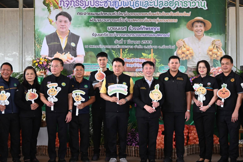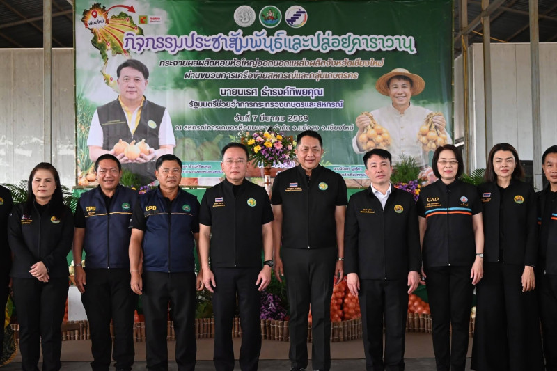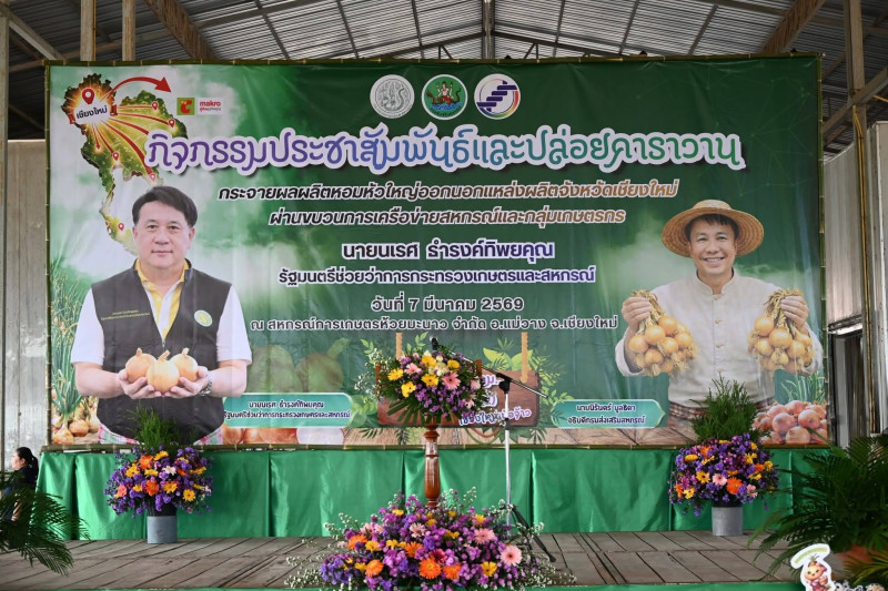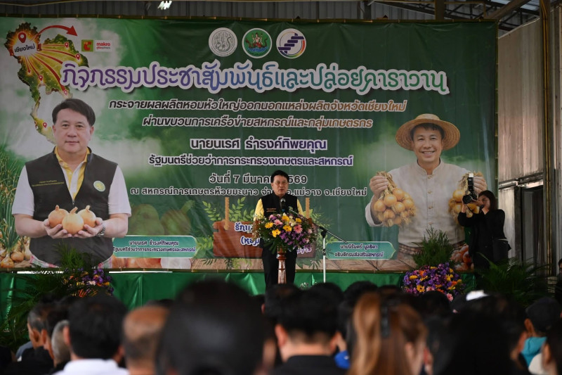 วันที่ 7 มีนาคม 2569 นายนเรศ ธำรงค์ทิพยคุณ รัฐมนตรีช่วยว่าการกระทรวงเกษตรและสหกรณ์ เป็นประธานในพิธีปล่อยคาราวานหอมหัวใหญ่ กิจกรรมกระจายผลผลิตหอมหัวใหญ่ออกนอกแหล่งผลิตภายใต้แคมเปญ “รักนะจึงให้หอม (หอมหัวใหญ่) เชียงใหม่เน้อจ้าว” จำนวน 12 คัน สู่ตลาดปลายทางทั่วประเทศ โดยมี นายนิรันดร์ มูลธิดา อธิบดีกรมส่งเสริมสหกรณ์ นายอนุรัตน์ เลื่อนลอย ผู้อำนวยการสำนักพัฒนาและถ่ายทอดเทคโนโลยีการสหกรณ์ คณะผู้บริหารกรมส่งเสริมสหกรณ์ และเกษตรกรในพื้นที่อำเภอแม่วาง และสันป่าตอง เข้าร่วม ณ สหกรณ์การเกษตรห้วยมะนาว จำกัด ตำบลดอนเปา อำเภอแม่วาง จังหวัดเชียงใหม่